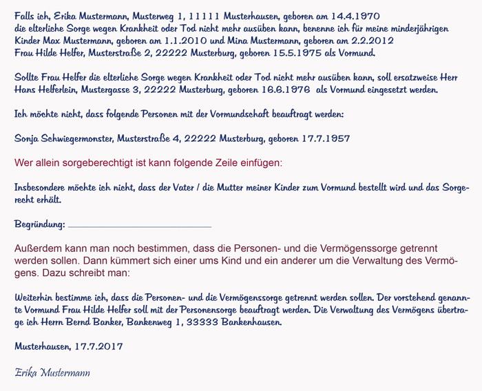 - Im Text sollte ein gewünschter Vormund benannt werden, mit Vor- und Nachname, Geburtsdatum und Wohnort