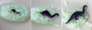 Als die Kinder die Eier gefunden hatten, erzählte ich ihnen, dass die Eier ja normalerweise von Dinosauriern ausgebrütet werden, was nun ja nicht mehr möglich sei, da die Dinosaurier ausgestorben sind. Ich hätte da aber eine Zauberflüssigkeit. Wenn man die Eier damit besprühe, dann schlüpften kleine Dinos heraus. Ich hatte eine Sprühflasche mit verdünnter Essigessenz vorbereitet und nacheinander ließen die Kinder ihre Saurier ausschlüpfen. Diese spülten wir unter Wasser ab und sie wanderten in die Mitgebsel-Tüte.