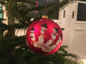 Für eine Weihnachtskugel mit persönlichem Touch, die ich beim Happyhomeblog entdeckt habe, braucht man lediglich einfarbige Christbaumkugeln (am besten aus Plastik und mit einem Durchmesser von zirka 5 Zentimetern) und weiße Finger- oder Acrylfarbe sowie einen roten und schwarzen Filzstift oder Edding. Man bemalt die Hand des Kindes mit der weißen Farbe und gibt ihm dann die Kugel in die Hand, so dass der Handabdruck drauf kommt. Die Finger sollten nach oben zeigen, der Handballen ist unten auf der Kugel. Wenn die Farbe trocken ist, werden aus den fünf Fingern mit Hilfe des Eddings Schneemänner. Dazu muss man nur noch je einen Hut, Augen, Nase, Mund und Knöpfe vervollständigen. Bei kleineren Kindern müssen das die Eltern machen, größere können selbst malen. Fertig ist die Christbaumkugel mit persönlicher Note.
